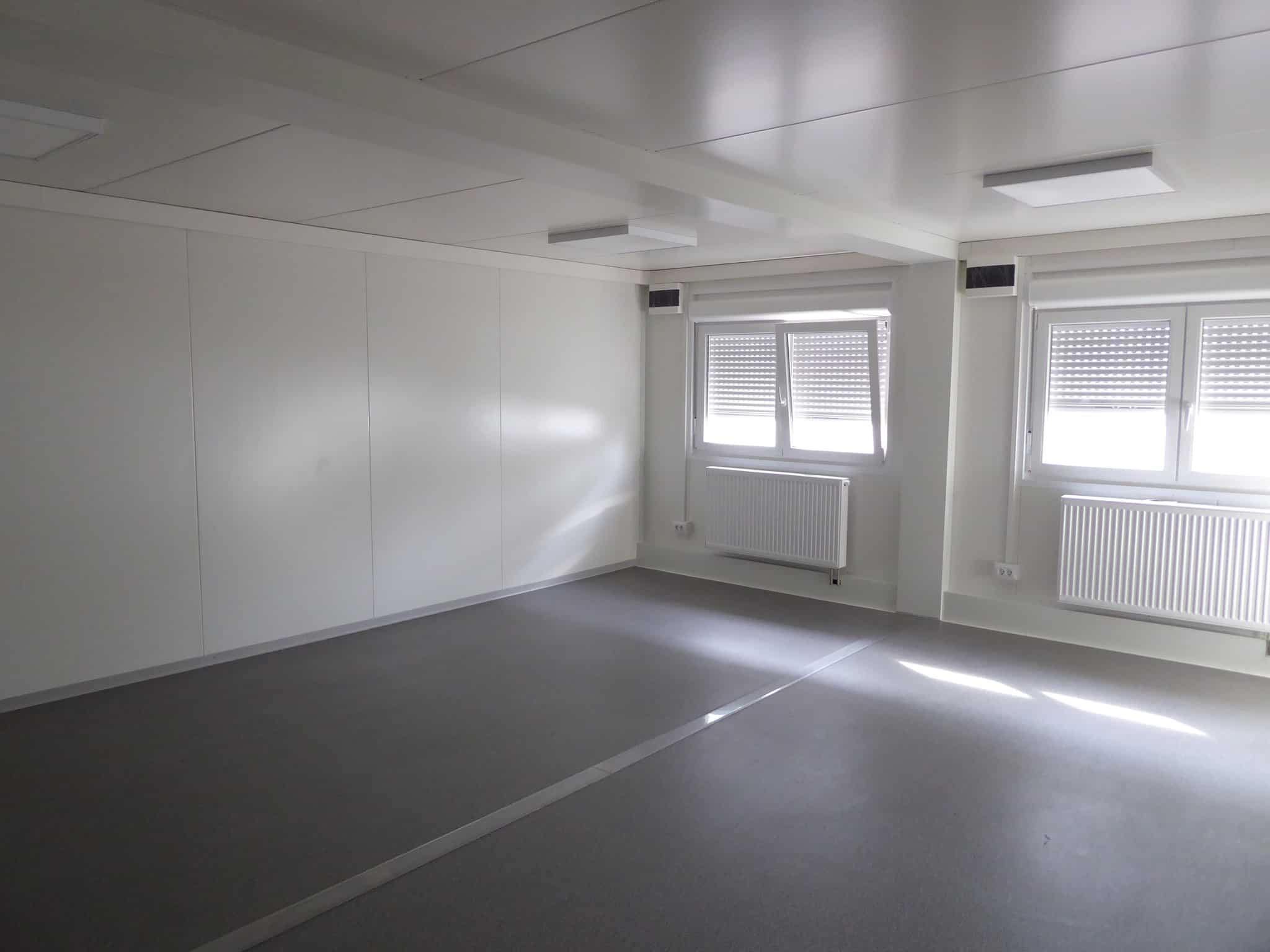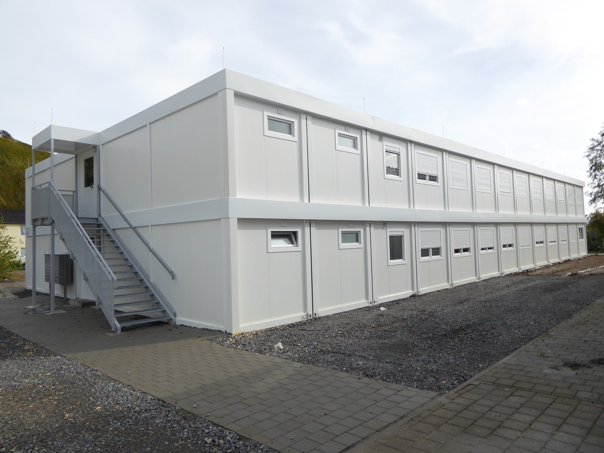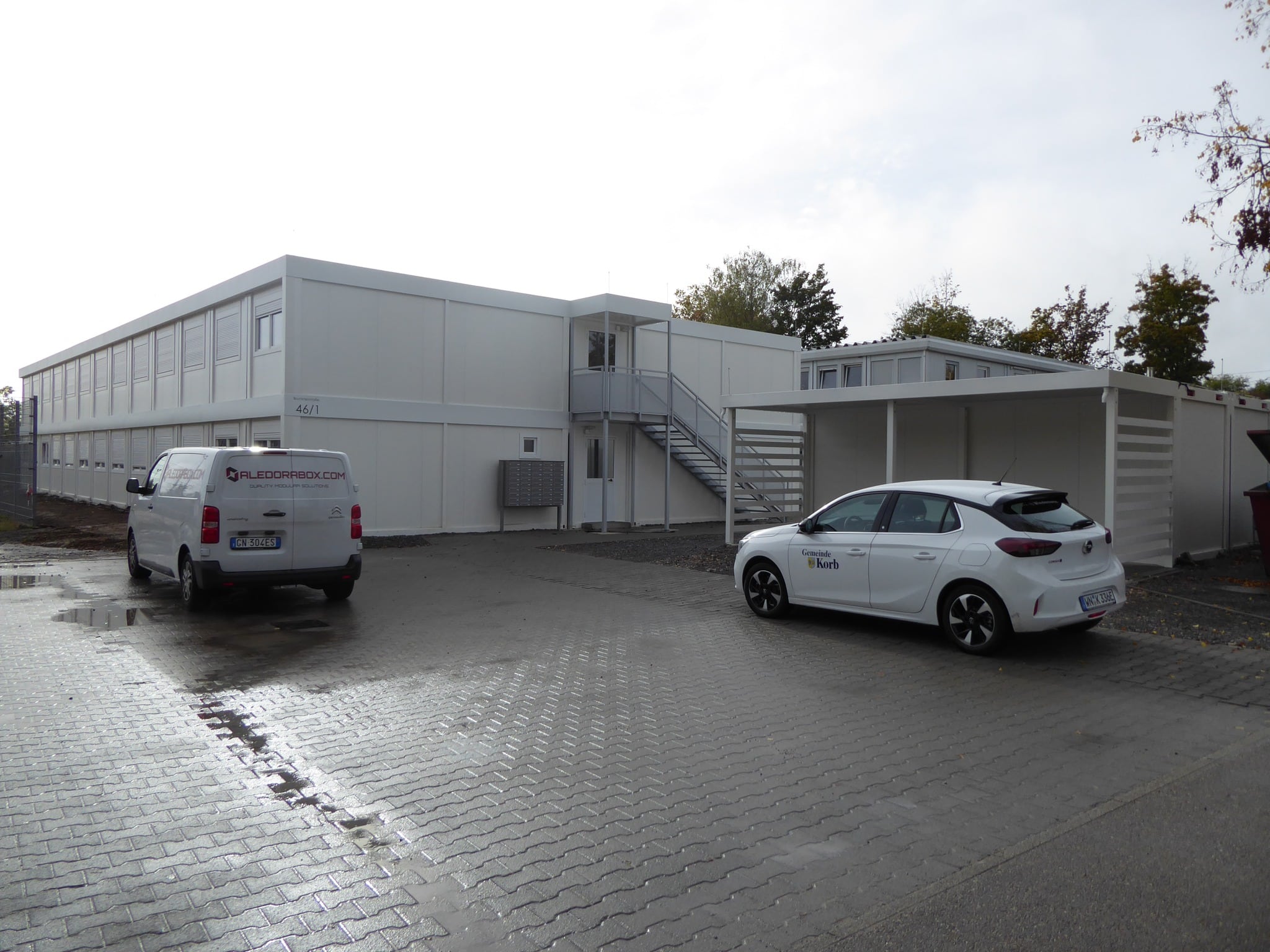 Edificio sviluppato su due livelli, destinato all’alloggio temporaneo dei profughi a Korb, Germania. Dimensioni esterne 31.694×15.020mm, completo di scale per l’accesso al primo piano e struttura antisismica. Ciascun piano è composto da 21 unità abitative, sala ricreazione con cucina e due bagni. In corrispondenza degli alloggi è stata assemblata una struttura formata da sei container, adibita al deposito delle biciclette, locale caldaia e lavanderia.